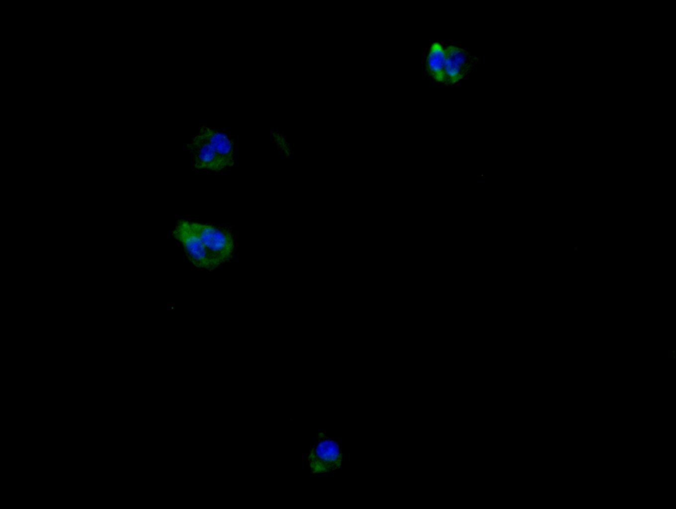 Immunofluorescence staining of MCF-7 cell with CSB-PA875651LA01HU at 1:400, counter-stained with DAPI. The cells were fixed in 4% formaldehyde and blocked in 10% normal Goat Serum. The cells were then incubated with the antibody overnight at 4C. The secondary antibody was Alexa Fluor 488-congugated AffiniPure Goat Anti-Rabbit IgG(H+L).