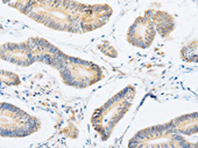 The image on the left is immunohistochemistry of paraffin-embedded Human colon cancer tissue using CSB-PA051678(ABHD1 Antibody) at dilution 1/15, on the right is treated with fusion protein. (Original magnification: ×200)