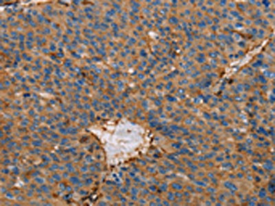 The image on the left is immunohistochemistry of paraffin-embedded Human liver cancer tissue using CSB-PA084581(ACTA1 Antibody) at dilution 1/65, on the right is treated with fusion protein. (Original magnification: ×200)
