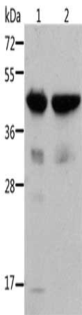 Gel: 10%SDS-PAGE, Lysate: 40 μg, Lane 1-2: Mouse muscle tissue, Mouse heart tissue, Primary antibody: CSB-PA084581(ACTA1 Antibody) at dilution 1/500, Secondary antibody: Goat anti rabbit IgG at 1/8000 dilution, Exposure time: 20 seconds