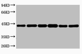 • Western blot analysis of HepG2 (1), Rat liver (2), Mouse kidney (3), Rabbit testic (4), Sheep lung (5), 293T (6), diluted at 1:5000.