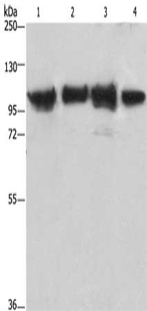 Gel: 6%SDS-PAGE, Lysate: 40 μg, Lane 1-4: Lovo cells, mouse kidney tissue, 231 cells, hepG2 cells, Primary antibody: CSB-PA070925(ACTN4 Antibody) at dilution 1/485, Secondary antibody: Goat anti rabbit IgG at 1/8000 dilution, Exposure time: 10 seconds