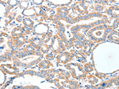 The image on the left is immunohistochemistry of paraffin-embedded Human thyroid cancer tissue using CSB-PA597708(ADCK1 Antibody) at dilution 1/40, on the right is treated with fusion protein. (Original magnification: ×200)