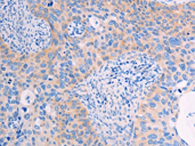 The image on the left is immunohistochemistry of paraffin-embedded Human cervical cancer tissue using CSB-PA899511(ADHFE1 Antibody) at dilution 1/60, on the right is treated with synthetic peptide. (Original magnification: ×200)