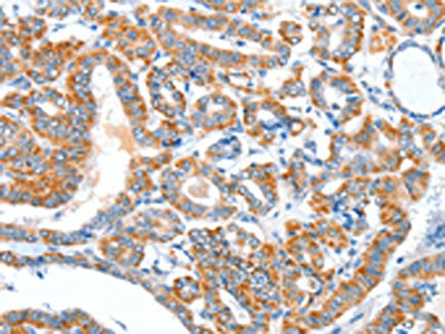 The image on the left is immunohistochemistry of paraffin-embedded Human thyroid cancer tissue using CSB-PA784753(AEBP2 Antibody) at dilution 1/25, on the right is treated with fusion protein. (Original magnification: ×200)