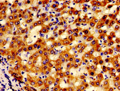 IHC image of CSB-PA819895LA01HU diluted at 1:600 and staining in paraffin-embedded human liver cancer performed on a Leica BondTM system. After dewaxing and hydration, antigen retrieval was mediated by high pressure in a citrate buffer (pH 6.0). Section was blocked with 10% normal goat serum 30min at RT. Then primary antibody (1% BSA) was incubated at 4°C overnight. The primary is detected by a biotinylated secondary antibody and visualized using an HRP conjugated SP system.