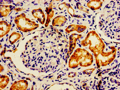 IHC image of CSB-PA819895LA01HU diluted at 1:600 and staining in paraffin-embedded human kidney tissue performed on a Leica BondTM system. After dewaxing and hydration, antigen retrieval was mediated by high pressure in a citrate buffer (pH 6.0). Section was blocked with 10% normal goat serum 30min at RT. Then primary antibody (1% BSA) was incubated at 4°C overnight. The primary is detected by a biotinylated secondary antibody and visualized using an HRP conjugated SP system.