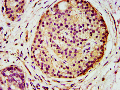 IHC image of CSB-PA001457LA01HU diluted at 1:500 and staining in paraffin-embedded human pancreatic cancer performed on a Leica BondTM system. After dewaxing and hydration, antigen retrieval was mediated by high pressure in a citrate buffer (pH 6.0). Section was blocked with 10% normal goat serum 30min at RT. Then primary antibody (1% BSA) was incubated at 4°C overnight. The primary is detected by a biotinylated secondary antibody and visualized using an HRP conjugated SP system.