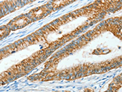 The image on the left is immunohistochemistry of paraffin-embedded Human colon cancer tissue using CSB-PA286707(AGR3 Antibody) at dilution 1/15, on the right is treated with fusion protein. (Original magnification: ×200)