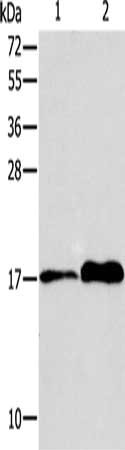 Gel: 15%SDS-PAGE, Lysate: 40 μg, Lane 1-2: MCF7 cells, human colon tissue, Primary antibody: CSB-PA286707(AGR3 Antibody) at dilution 1/150, Secondary antibody: Goat anti rabbit IgG at 1/8000 dilution, Exposure time: 20 seconds