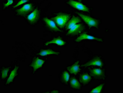 Immunofluorescence staining of Hela cells with CSB-PA618638EA01HU at 1:66, counter-stained with DAPI. The cells were fixed in 4% formaldehyde, permeabilized using 0.2% Triton X-100 and blocked in 10% normal Goat Serum. The cells were then incubated with the antibody overnight at 4°C. The secondary antibody was Alexa Fluor 488-congugated AffiniPure Goat Anti-Rabbit IgG(H+L).