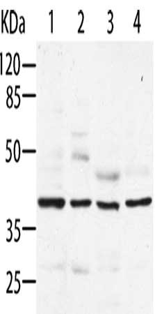 Gel: 8%SDS-PAGE, Lysate: 40 μg, Lane 1-4: Hela cells, HepG2 cells, MCF7 cells, HT29 cells, Primary antibody: CSB-PA151818(AIMP2 Antibody) at dilution 1/200, Secondary antibody: Goat anti rabbit IgG at 1/8000 dilution, Exposure time: 1 minute
