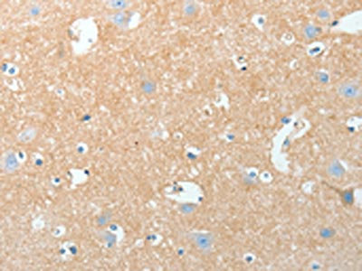 The image on the left is immunohistochemistry of paraffin-embedded Human brain tissue using CSB-PA097902(AKAP7 Antibody) at dilution 1/15, on the right is treated with fusion protein. (Original magnification: ×200)