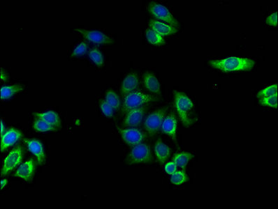 Immunofluorescence staining of HepG2 cells with CSB-PA001529LA01HU at 1:120,counter-stained with DAPI. The cells were fixed in 4% formaldehyde, permeabilized using 0.2% Triton X-100 and blocked in 10% normal Goat Serum. The cells were then incubated with the antibody overnight at 4°C.The secondary antibody was Alexa Fluor 488-congugated AffiniPure Goat Anti-Rabbit IgG (H+L).