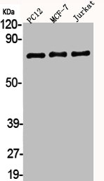 • Western Blot analysis of PC12 MCF7 Jurkat cells using AKAP 95 Polyclonal Antibody