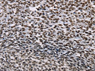 The image on the left is immunohistochemistry of paraffin-embedded Human ovarian cancer tissue using CSB-PA550074(AKAP8L Antibody) at dilution 1/15, on the right is treated with fusion protein. (Original magnification: ×200)