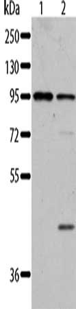 Gel: 8%SDS-PAGE, Lysate: 40 μg, Lane 1-2: Jurkat cells, 293T cells, Primary antibody: CSB-PA550074(AKAP8L Antibody) at dilution 1/84, Secondary antibody: Goat anti rabbit IgG at 1/8000 dilution, Exposure time: 20 seconds