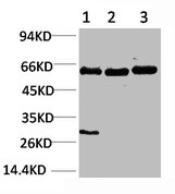 • Western blot analysis of 1) Hela, 2) 3T3, 3) PC12 using Akt2 Polyclonal Antibody.