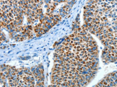 • The image on the left is immunohistochemistry of paraffin-embedded Human liver cancer tissue using CSB-PA935612(ALDH4A1 Antibody) at dilution 1/45, on the right is treated with fusion protein. (Original magnification: ×200)
