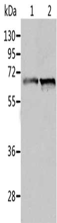 • Gel: 10%SDS-PAGE, Lysate: 40 μg, Lane 1-2: Human fetal liver tissue, Human liver cancer tissue, Primary antibody: CSB-PA935612(ALDH4A1 Antibody) at dilution 1/450, Secondary antibody: Goat anti rabbit IgG at 1/8000 dilution, Exposure time: 30 seconds