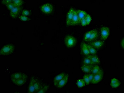 • Immunofluorescence staining of HepG2 cells with CSB-PA647192LA01HU at 1:105, counter-stained with DAPI. The cells were fixed in 4% formaldehyde, permeabilized using 0.2% Triton X-100 and blocked in 10% normal Goat Serum. The cells were then incubated with the antibody overnight at 4°C. The secondary antibody was Alexa Fluor 488-congugated AffiniPure Goat Anti-Rabbit IgG(H+L).