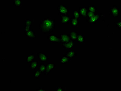 Immunofluorescence staining of Hela cells with CSB-PA001624LA01HU at 1:110,counter-stained with DAPI. The cells were fixed in 4% formaldehyde, permeabilized using 0.2% Triton X-100 and blocked in 10% normal Goat Serum. The cells were then incubated with the antibody overnight at 4°C.The secondary antibody was Alexa Fluor 488-congugated AffiniPure Goat Anti-Rabbit IgG (H+L).