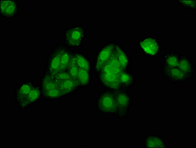 Immunofluorescence staining of HepG2 cells with CSB-PA001646LA01HU at 1:133, counter-stained with DAPI. The cells were fixed in 4% formaldehyde, permeabilized using 0.2% Triton X-100 and blocked in 10% normal Goat Serum. The cells were then incubated with the antibody overnight at 4°C. The secondary antibody was Alexa Fluor 488-congugated AffiniPure Goat Anti-Rabbit IgG(H+L).