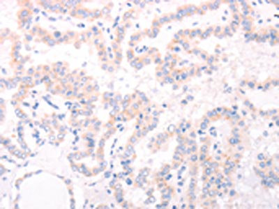 • The image on the left is immunohistochemistry of paraffin-embedded Human thyroid cancer tissue using CSB-PA904437(AMH Antibody) at dilution 1/30, on the right is treated with synthetic peptide. (Original magnification: ×200)