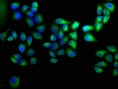 Immunofluorescence staining of Hela cells with CSB-PA875635LA01HU at 1:100, counter-stained with DAPI. The cells were fixed in 4% formaldehyde, permeabilized using 0.2% Triton X-100 and blocked in 10% normal Goat Serum. The cells were then incubated with the antibody overnight at 4°C. The secondary antibody was Alexa Fluor 488-congugated AffiniPure Goat Anti-Rabbit IgG(H+L).