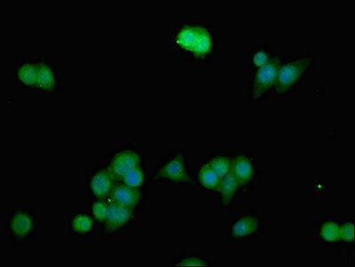 • Immunofluorescent analysis of PC-3 cells using CSB-PA804805LA01HU at dilution of 1:100 and Alexa Fluor 488-congugated AffiniPure Goat Anti-Rabbit IgG(H+L)