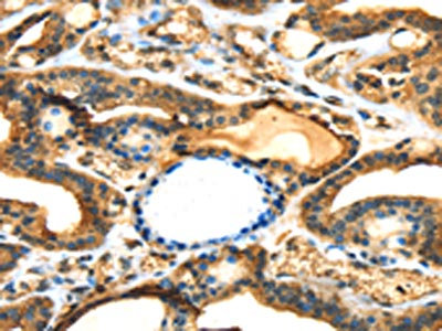 The image on the left is immunohistochemistry of paraffin-embedded Human thyroid cancer tissue using CSB-PA558622(ANXA13 Antibody) at dilution 1/15, on the right is treated with fusion protein. (Original magnification: ×200)