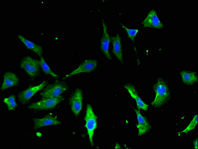 Immunofluorescent analysis of Hela cells using CSB-PA001840HA01HU at dilution of 1:100 and Alexa Fluor 488-congugated AffiniPure Goat Anti-Rabbit IgG(H+L)