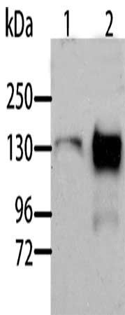 Gel: 10%SDS-PAGE, Lysate: 40 μg, Lane 1-2: Human liver cancer tissue, Human normal liver tissue, Primary antibody: CSB-PA598136(AOX1 Antibody) at dilution 1/1000, Secondary antibody: Goat anti rabbit IgG at 1/8000 dilution, Exposure time: 90 seconds