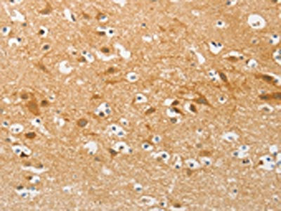 The image on the left is immunohistochemistry of paraffin-embedded Human brain tissue using CSB-PA248529(AP2M1 Antibody) at dilution 1/20, on the right is treated with fusion protein. (Original magnification: ×200)