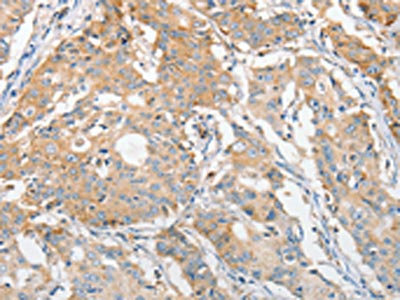 • The image on the left is immunohistochemistry of paraffin-embedded Human gastric cancer tissue using CSB-PA117483(APOBEC3G Antibody) at dilution 1/30, on the right is treated with fusion protein. (Original magnification: ×200)