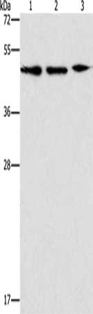 • Gel: 12%SDS-PAGE, Lysate: 40 μg, Lane 1-3: PC3 cells, Jurkat cells, Raji cells, Primary antibody: CSB-PA117483(APOBEC3G Antibody) at dilution 1/240, Secondary antibody: Goat anti rabbit IgG at 1/8000 dilution, Exposure time: 30 seconds