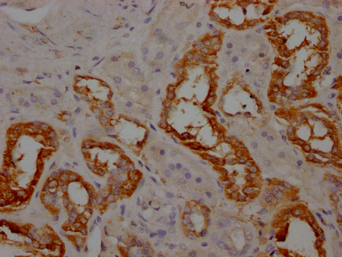 • IHC image of CSB-PA001947LA01HU diluted at 1:100 and staining in paraffin-embedded human kidney tissue performed on a Leica BondTM system. After dewaxing and hydration, antigen retrieval was mediated by high pressure in a citrate buffer (pH 6.0). Section was blocked with 10% normal goat serum 30min at RT. Then primary antibody (1% BSA) was incubated at 4°C overnight. The primary is detected by a Goat anti-rabbit IgG labeled by HRP and visualized using 0.05% DAB.