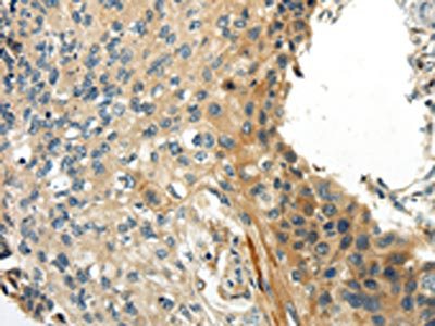 The image on the left is immunohistochemistry of paraffin-embedded Human esophagus cancer tissue using CSB-PA203676(AQP3 Antibody) at dilution 1/35, on the right is treated with synthetic peptide. (Original magnification: ×200)