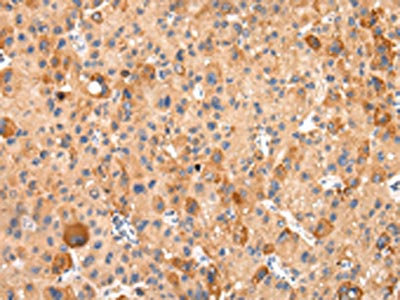 The image on the left is immunohistochemistry of paraffin-embedded Human liver cancer tissue using CSB-PA390632(AQP7 Antibody) at dilution 1/20, on the right is treated with synthetic peptide. (Original magnification: ×200)