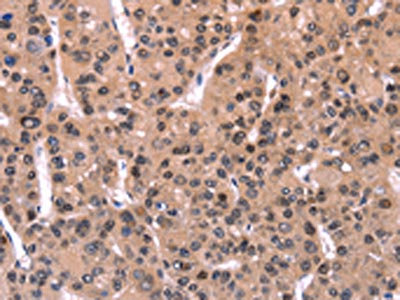 The image on the left is immunohistochemistry of paraffin-embedded Human liver cancer tissue using CSB-PA698018(ARC Antibody) at dilution 1/50, on the right is treated with fusion protein. (Original magnification: ×200)