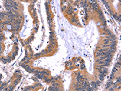 The image on the left is immunohistochemistry of paraffin-embedded Human colon cancer tissue using CSB-PA698018(ARC Antibody) at dilution 1/50, on the right is treated with fusion protein. (Original magnification: ×200)