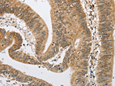 The image on the left is immunohistochemistry of paraffin-embedded Human colon cancer tissue using CSB-PA176612(ARHGAP25 Antibody) at dilution 1/40, on the right is treated with fusion protein. (Original magnification: ×200)