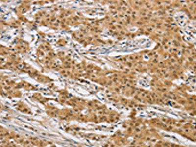 The image on the left is immunohistochemistry of paraffin-embedded Human gastic cancer tissue using CSB-PA176612(ARHGAP25 Antibody) at dilution 1/40, on the right is treated with fusion protein. (Original magnification: ×200)