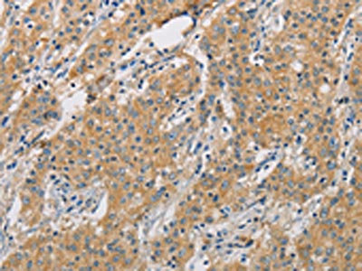 The image on the left is immunohistochemistry of paraffin-embedded Human gastric cancer tissue using CSB-PA600132(ARHGEF7 Antibody) at dilution 1/40, on the right is treated with fusion protein. (Original magnification: ×200)