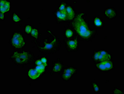 Immunofluorescence staining of MCF-7 cells with CSB-PA854026LA01HU at 1:166, counter-stained with DAPI. The cells were fixed in 4% formaldehyde, permeabilized using 0.2% Triton X-100 and blocked in 10% normal Goat Serum. The cells were then incubated with the antibody overnight at 4°C. The secondary antibody was Alexa Fluor 488-congugated AffiniPure Goat Anti-Rabbit IgG(H+L).