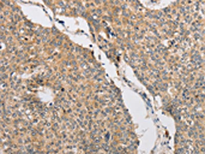 The image on the left is immunohistochemistry of paraffin-embedded Human thyroid cancer tissue using CSB-PA278026(ART3 Antibody) at dilution 1/40, on the right is treated with fusion protein. (Original magnification: ×200)