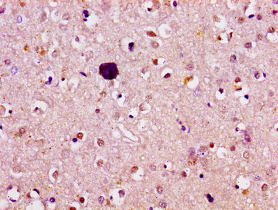 IHC image of CSB-PA855500LA01HU diluted at 1:100 and staining in paraffin-embedded human brain tissue performed on a Leica BondTM system. After dewaxing and hydration, antigen retrieval was mediated by high pressure in a citrate buffer (pH 6.0). Section was blocked with 10% normal goat serum 30min at RT. Then primary antibody (1% BSA) was incubated at 4°C overnight. The primary is detected by a biotinylated secondary antibody and visualized using an HRP conjugated SP system.