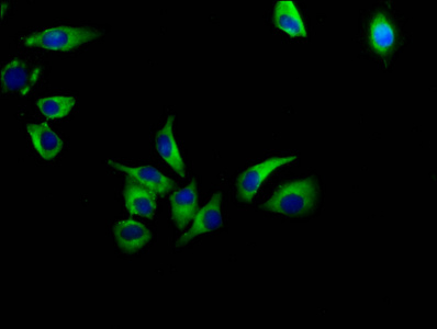 • Immunofluorescence staining of A549 cells with CSB-PA002468LA01HU at 1:133, counter-stained with DAPI. The cells were fixed in 4% formaldehyde, permeabilized using 0.2% Triton X-100 and blocked in 10% normal Goat Serum. The cells were then incubated with the antibody overnight at 4°C. The secondary antibody was Alexa Fluor 488-congugated AffiniPure Goat Anti-Rabbit IgG(H+L).