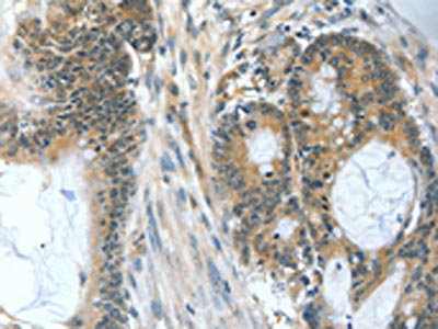 • The image on the left is immunohistochemistry of paraffin-embedded Human colon cancer tissue using CSB-PA213653(BAD Antibody) at dilution 1/60, on the right is treated with fusion protein. (Original magnification: ×200)
