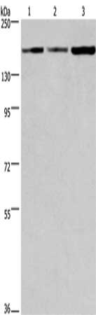 • Gel: 6%SDS-PAGE, Lysate: 40 μg, Lane 1-3: 293T cells, hela cells, hepG2 cells, Primary antibody: CSB-PA236225(BAG6 Antibody) at dilution 1/100, Secondary antibody: Goat anti rabbit IgG at 1/8000 dilution, Exposure time: 20 seconds